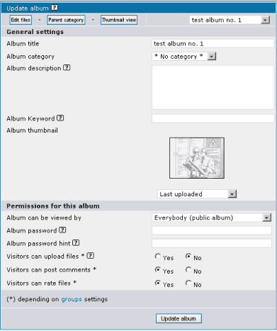 Pre-requisites: if you have set "Albums can be private" to YES on the config page, you can determine who will have permission to view the files of this album. If you have set the config option "Albums can be private" to NO (not recommended), you won't be able to specify access permissions, i.e. all albums will be public and the "Album can be viewed by" will not even be displayed.